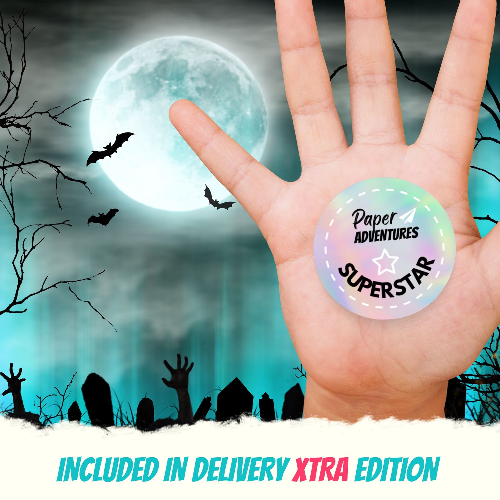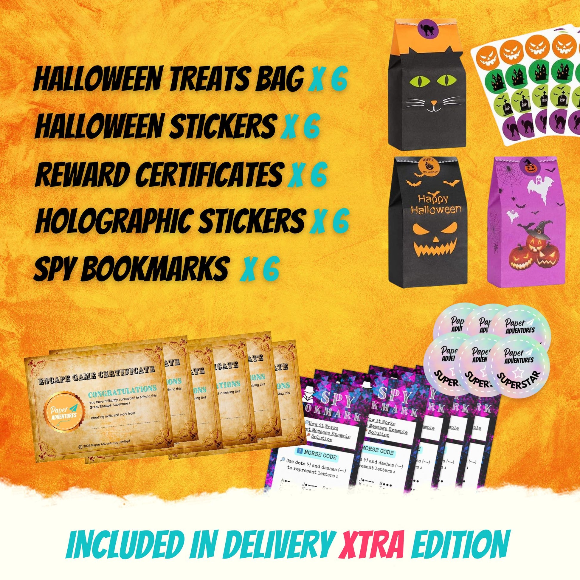 Choose between our 3 editions : either print-at-home edition for an immediate download of our escape room for kids files to print at home or our delivery pack edition (only in UK)Ā if you want a printed version sent to you directly in 2 to 4 working days. Now you can choose ourĀ delivery Xtra edition (only UK) that includes the printed game as well tons of fun escape goodies for the ultimate Haloween experience for your players.