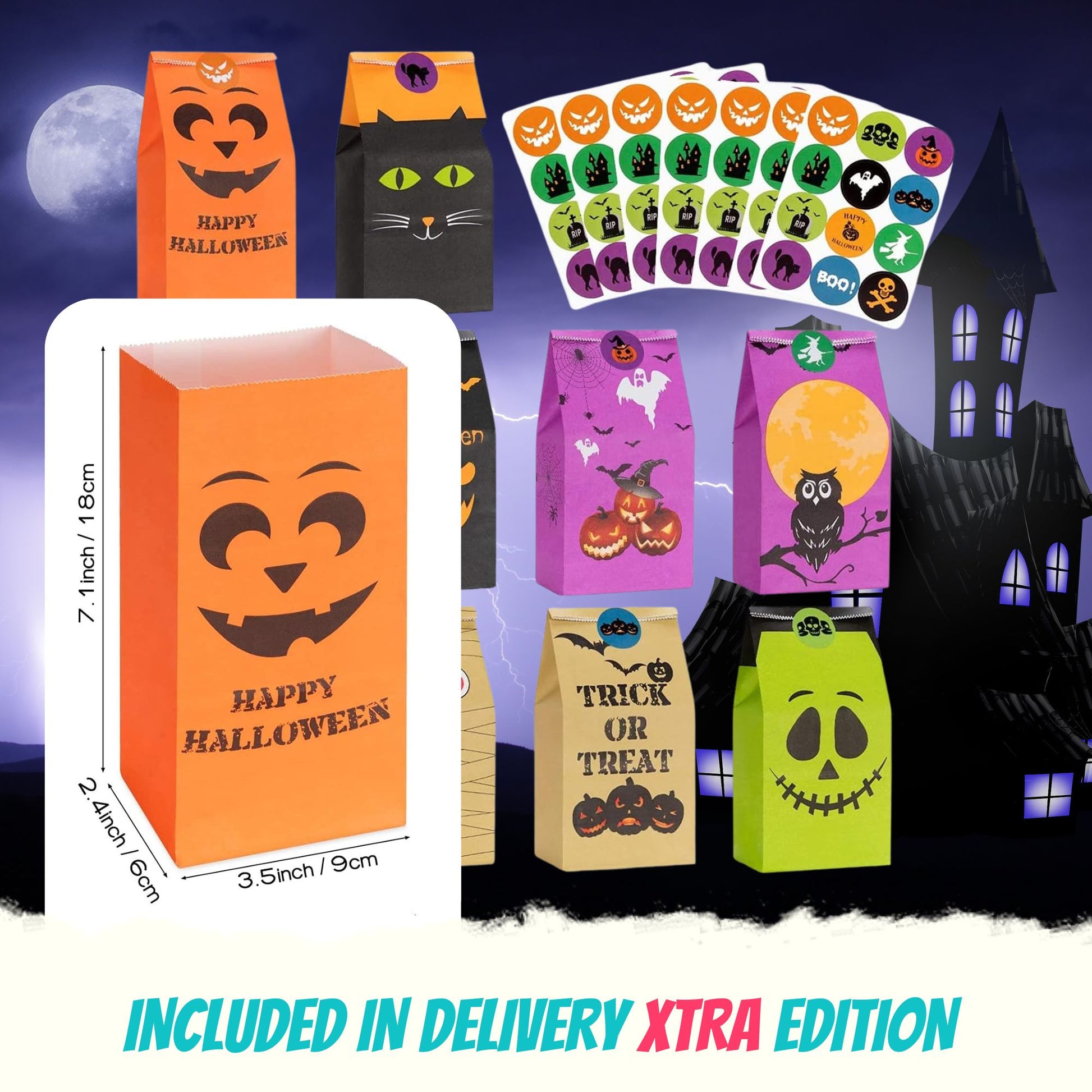 +6 Halloween Paper bags ā Halloween Treat or party bags (18cm x 9cm x 6cm) with fun spooky design, perfect for Halloween treats or all items in this bundle.